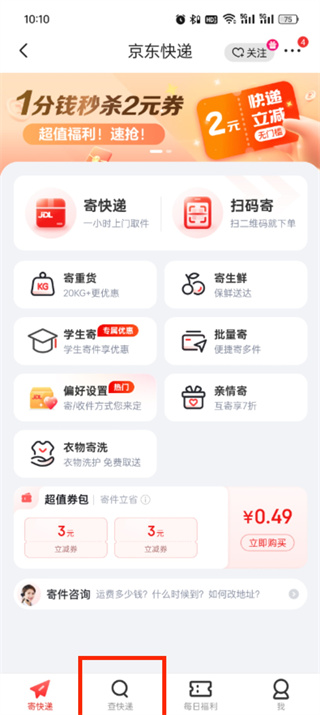 3、接着来到京东快递的页面中我们点击页面下方的【查快递】;
