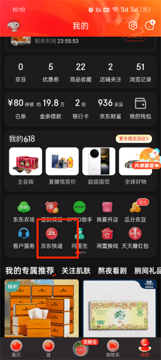 2、然后在我的页面中可以看到客户服务、京东快递、问医生等工具,我们点击【京东快递】;