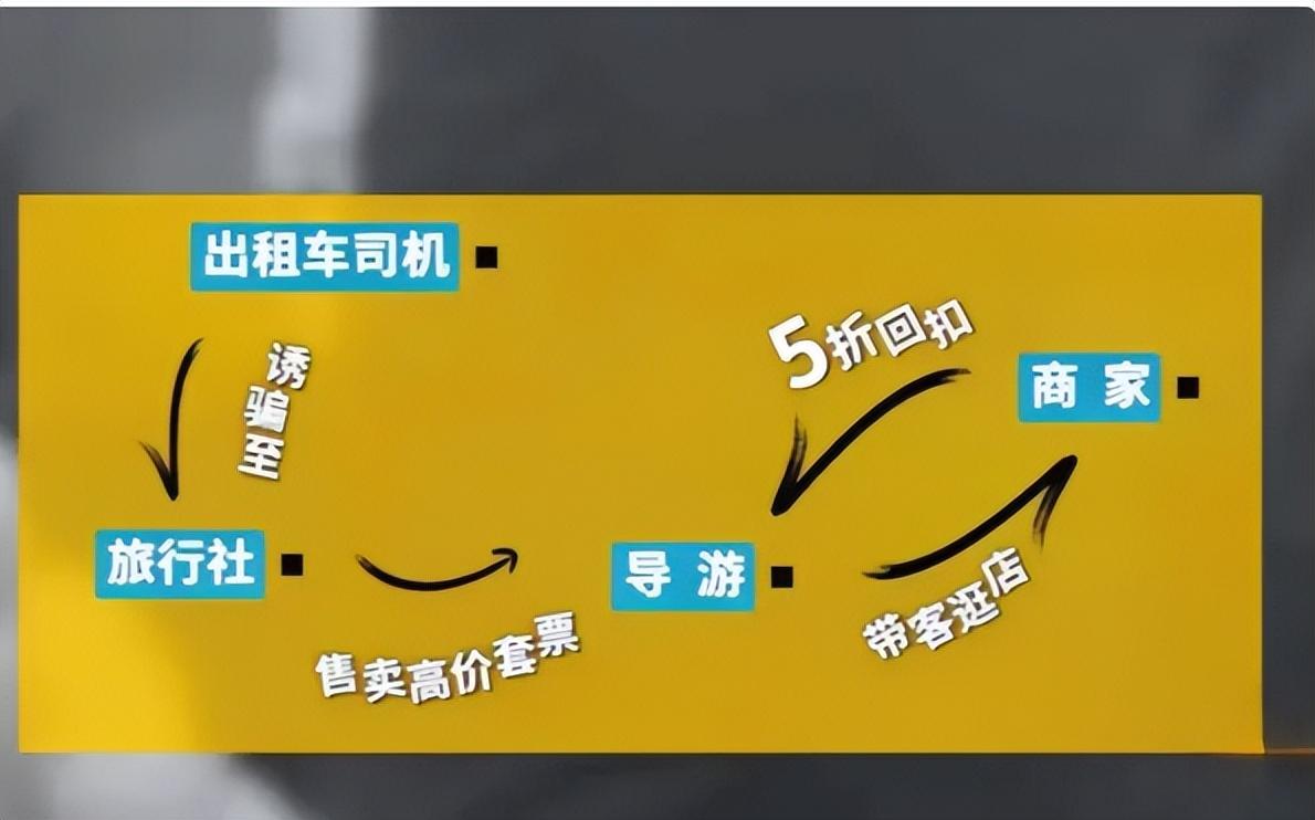 在央视的报道中,记者揭示了出租车司机、旅行社、导游和商家之间密切的利益连接,形成一条完整的“宰客链条”