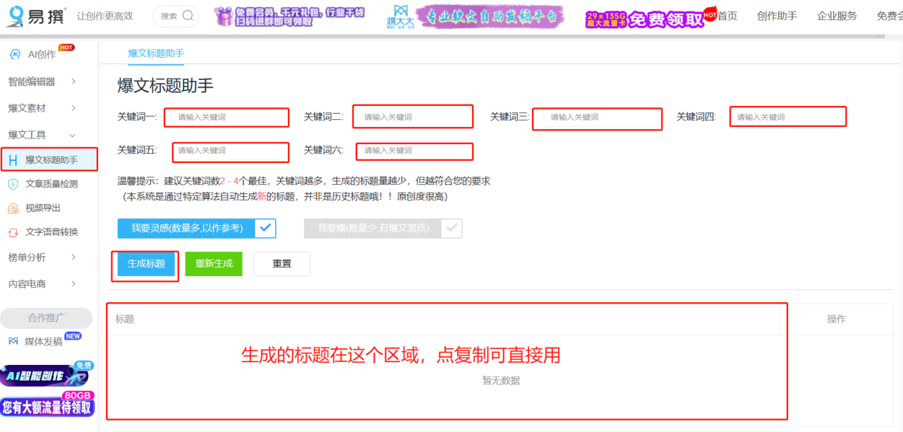 接下来,在左侧菜单栏中找到【爆文工具】,然后选择【爆文标题助手】。在页面顶部的输入框中输入你想要的关键词,然后点击下方的【生成标题】按钮,操作非常简单。