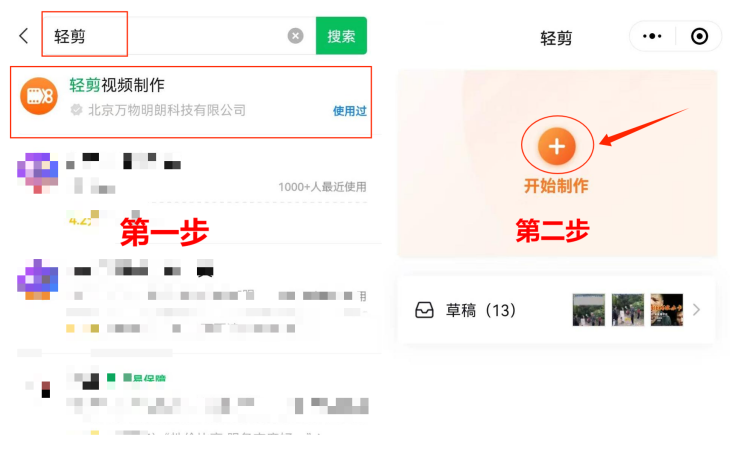 1、首先在微信小程序中搜索“轻剪”,出现的就是第一个小程序,点击进入开始制作。
