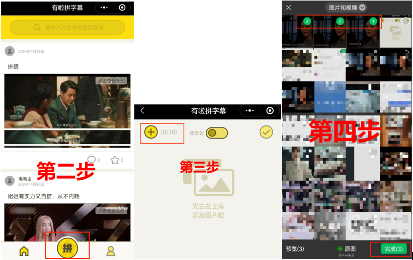 2、进入后,点击下方“拼”字,接着点击左上角“+”号,选择要拼的三张图片。点右下角“完成”。