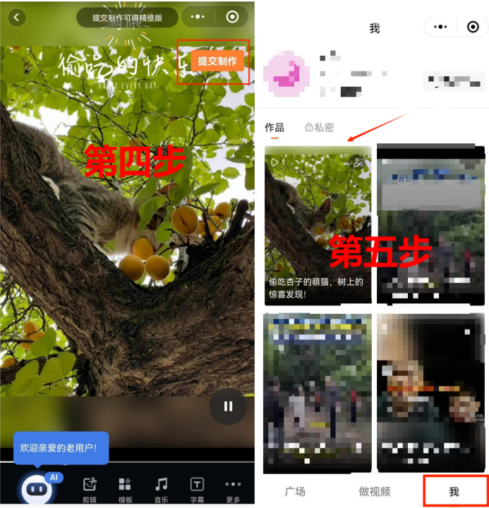 3、当我们将视频剪辑完成后,点击“提交制作”。然后,点击右下角“我”就能看见作品。