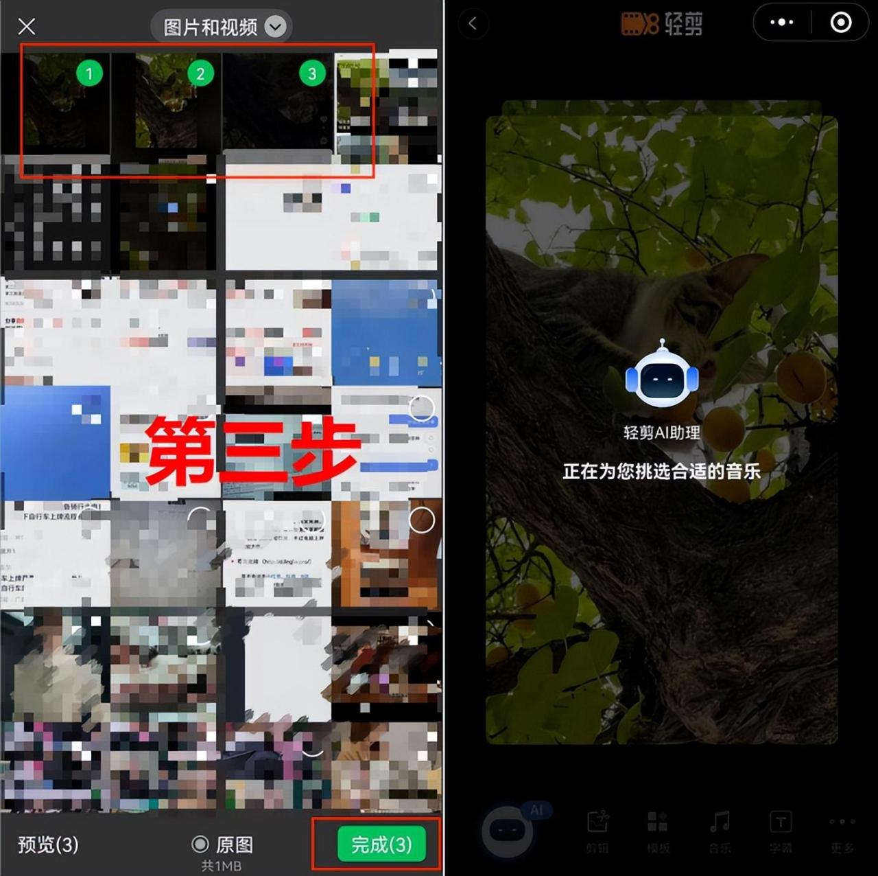 2、点击“开始制作”按钮,然后从你的手机相册中选择需要剪辑的素材,接着点击右下角的“完成”按钮,即可进入剪辑界面。这个小程序有一个非常贴心的功能:AI助理。它会根据你选择的素材自动配上音乐并应用模板,这对于懒人和新手来说非常方便。