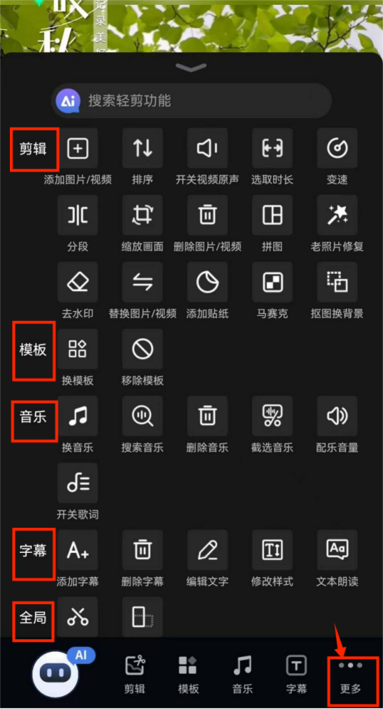 如果你想自己动手剪辑,可以点击右下角的“更多”按钮,这样就会弹出功能界面。在这个界面上,你可以自由地进行剪辑、选择音乐、应用模板、添加字幕等操作。