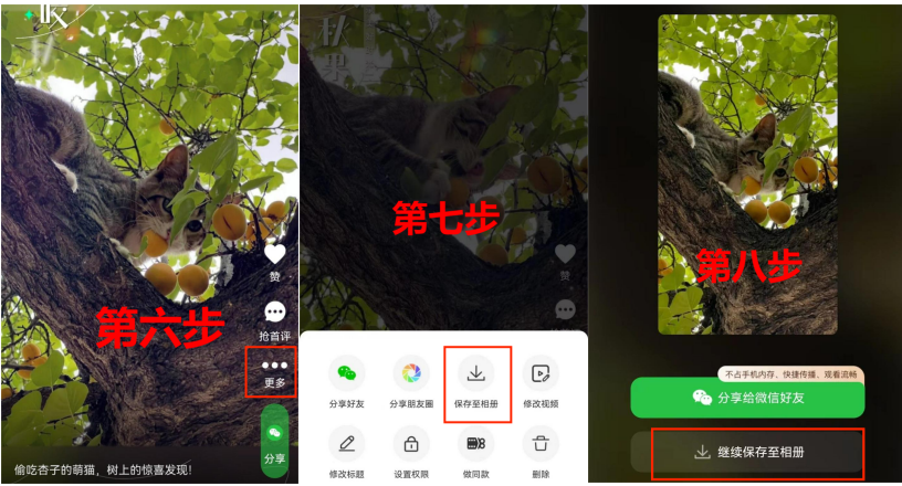 4、点开作品,点“更多”,再点击“保存至相册”,最后点击“继续保存至相册”。就可以将视频保存了。