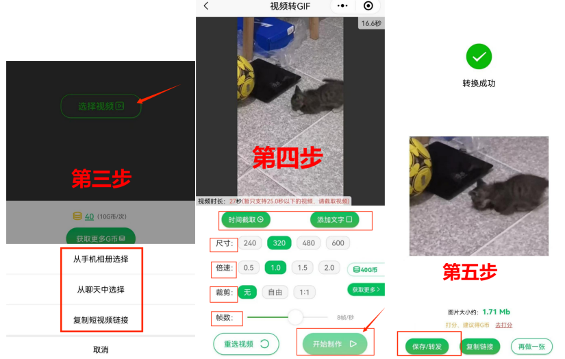 2、点击“GIF”制作按钮进入制作界面,接着点击“选择视频”,按照界面提示进行操作。操作完成后,点击“开始制作”。制作完成后,你可以点击“保存/转发”来保存或分享你的动图。