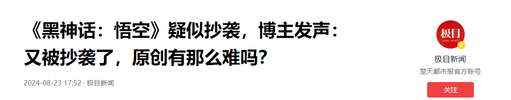 信息来源:极目新闻——《黑神话:悟空》疑似抄袭,博主发声:又被抄袭了,原创有那么难吗?2024年8月23日