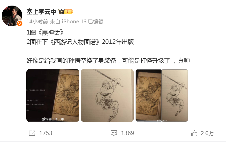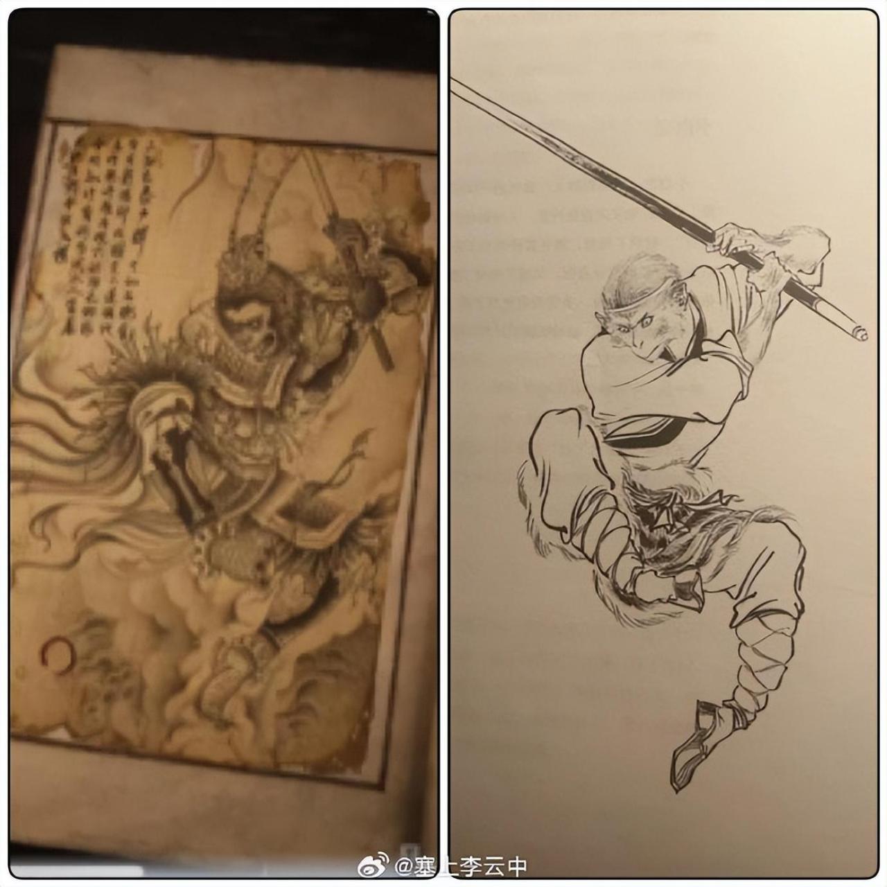 更加荒谬的是,8月23日,一位名为“塞上李云中”的国画博主声称,《黑神话:悟空》的游戏宣传图不过是将他曾经绘制的孙悟空形象换上了新的装备而已。