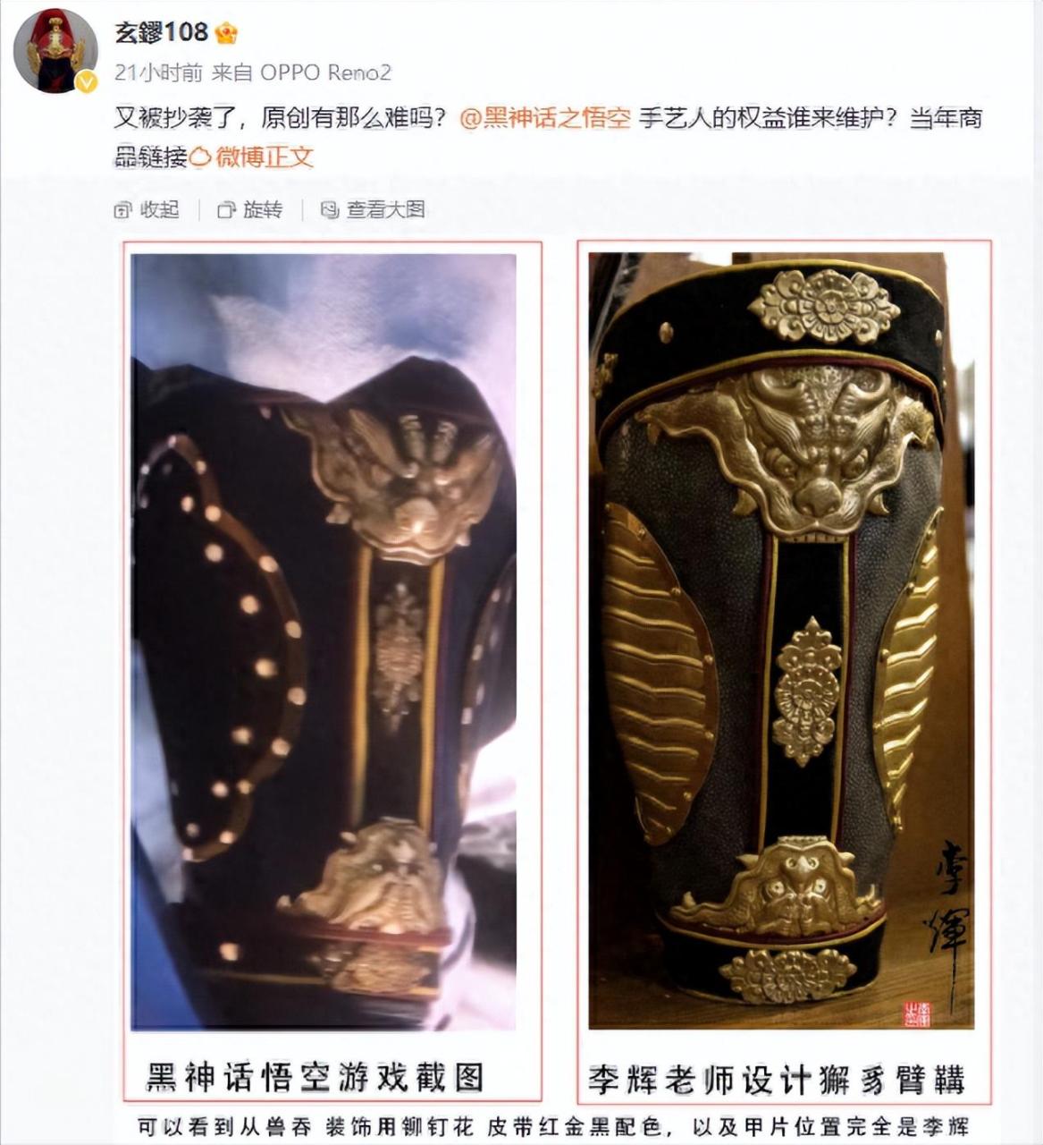 这位博主在微博上发声,称“又被抄袭了,原创真的很难吗?”,并附上了《黑神话:悟空》中杨戬的臂鞲和他自己曾经参与设计的臂鞲示意图。尽管这位博主的态度显得有些激烈,但通过对比这两张图片,我们可以看到两个臂鞲的设计几乎完全相同。